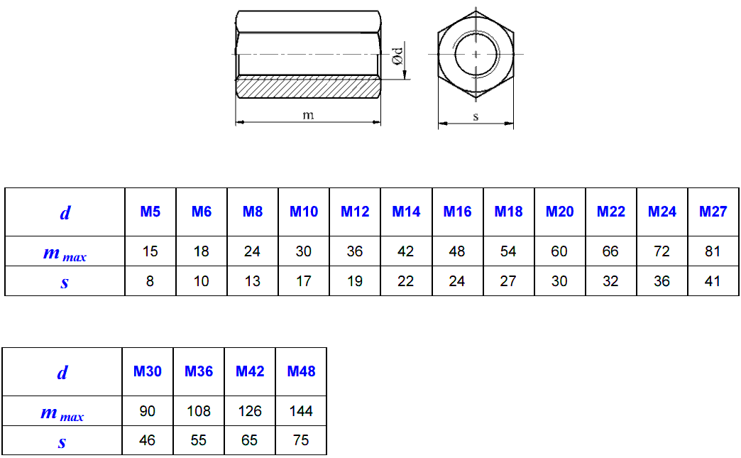 Nakrętki sześciokątne złączne DIN 6334 znajdują zastosowanie jako łączniki do połączeń gwintowych o tych samych średnicach.