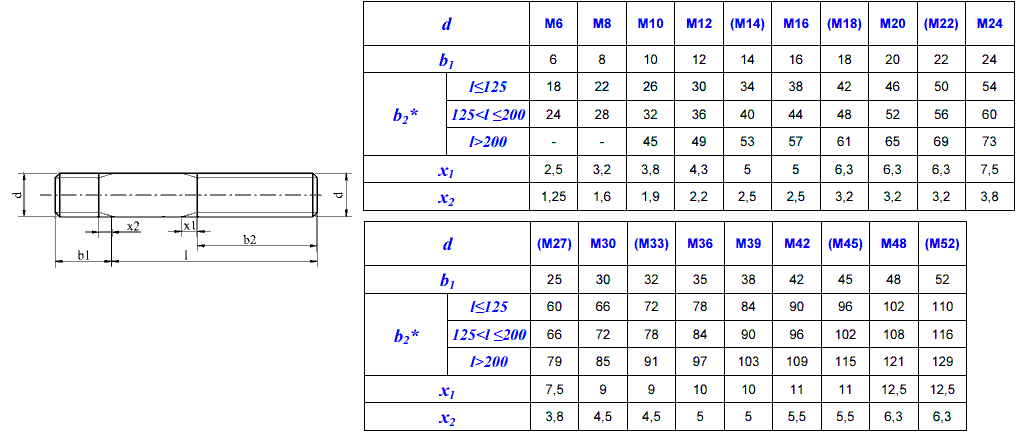 - b1(długość krótszej nagwintowanej części szpilki) = podana w tabeli poniżej