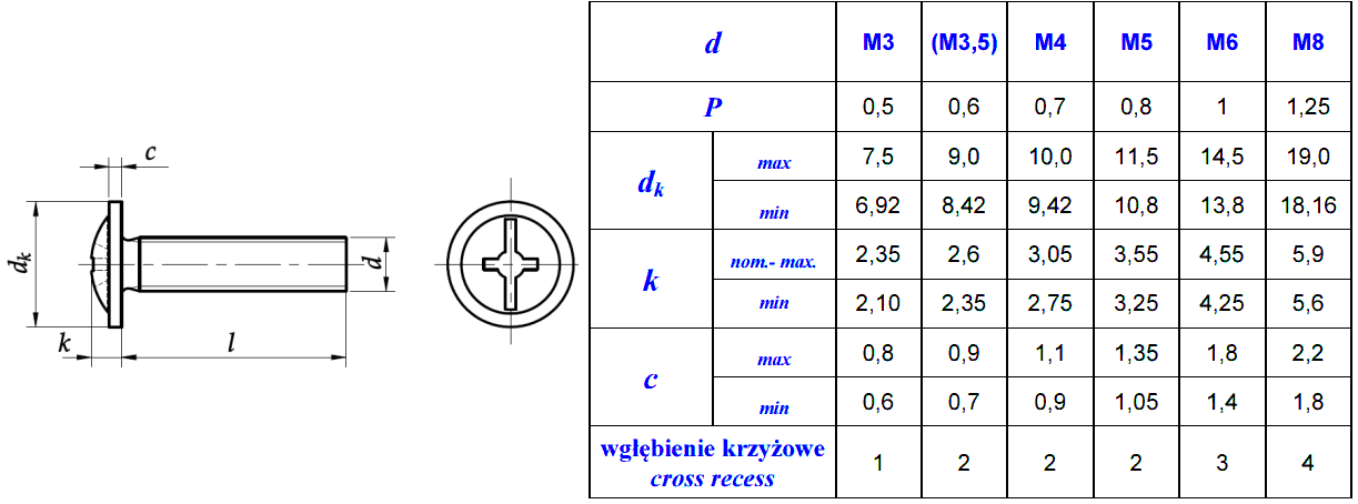 - k(wysokość łba z podkładką) = podana w tabeli poniżej
